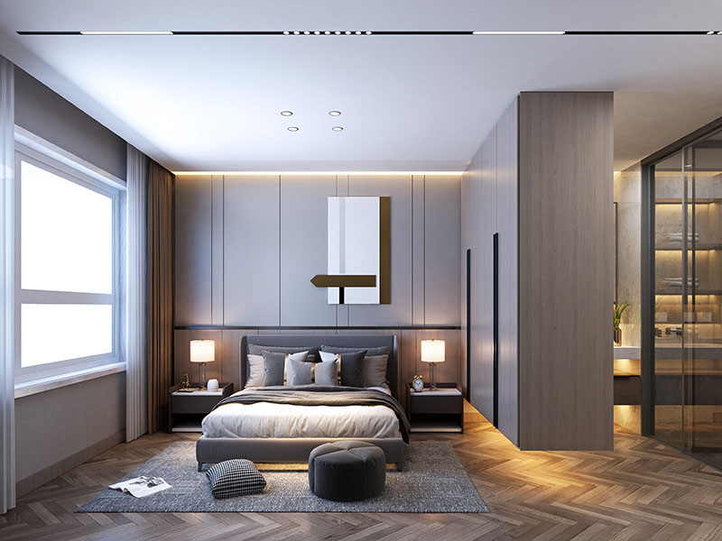 本案例风格定位于现代简约风,采用低调简洁的设计,兼顾实用性,在细节处合理提升空间氛围感。