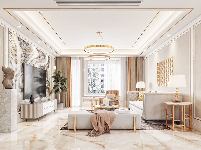 本案例风格定位于轻奢风,整体的温馨暖调设计以及大面积融入金属细节,呈现出轻奢氛围浓郁的居住空间。