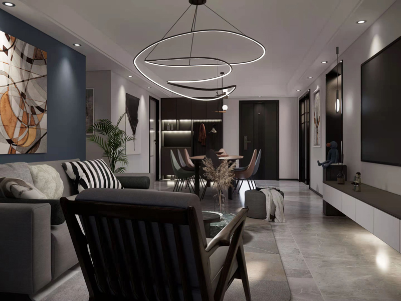 本案例风格定位于现代风,经典的黑白灰色调,让空间呈现出特有的个性于雅致,营造轻松和谐的生活氛围。