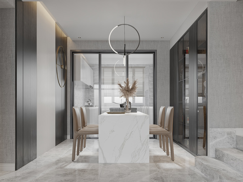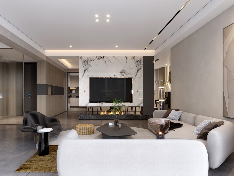 本案定位于现代轻奢风格,将石材、金属等不同材质的装饰相融合,并结合光影艺术,在实现舒适实用功能的同时,赋予空间艺术气质。