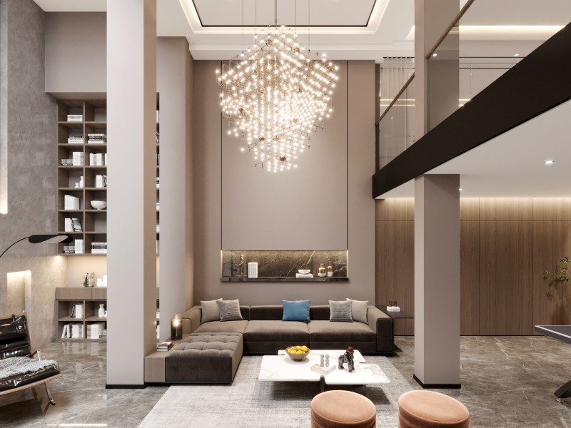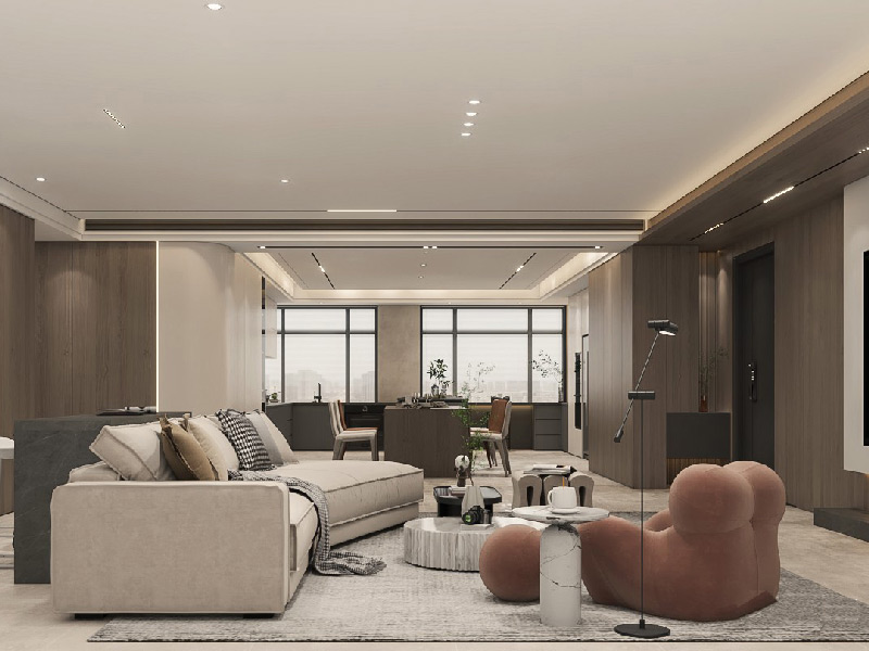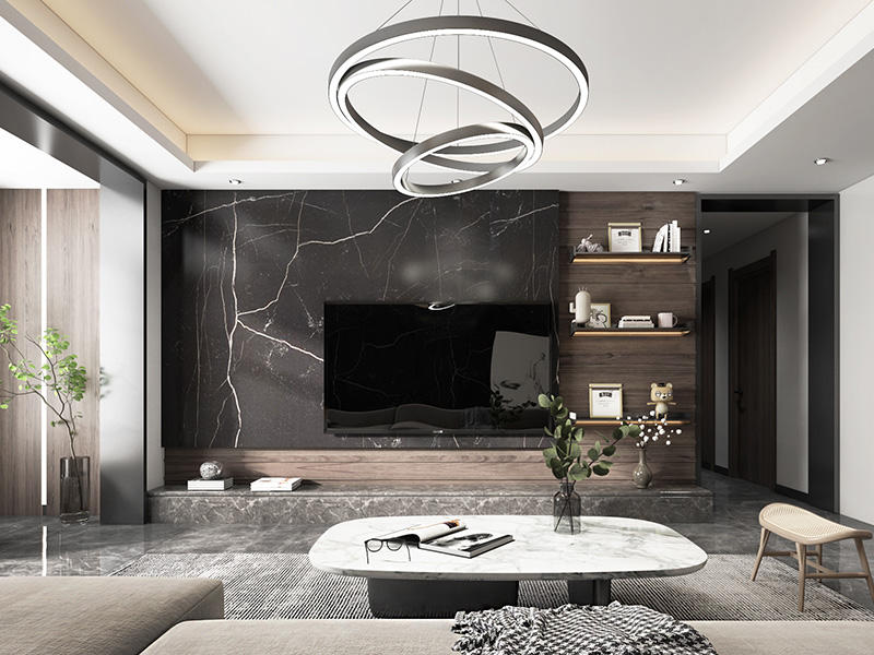 本案定位于现代风格,以灰色调布局室内空间,巧用石材、木材和金属等不同材质装饰间的视觉碰撞,结合光影艺术,彰显空间的时尚大气质感。