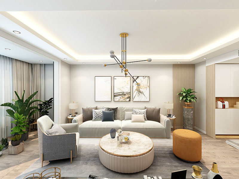 以简约风为设计基调,在浅色系室内空间,对硬装和软装等进行简化处理,并结合无主灯设计,打造简雅惬意的温暖小家。