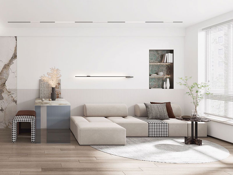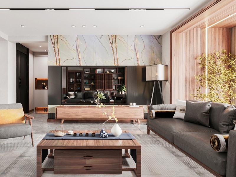 在现代建筑中,将浅灰色石材与木材巧妙结合,并融入无主灯设计,呈现现代简约风格家居空间。在喧闹都市,有一个简单舒适的休憩环境。