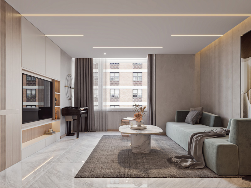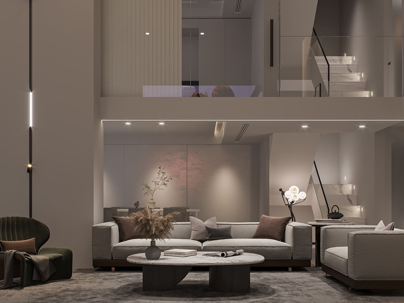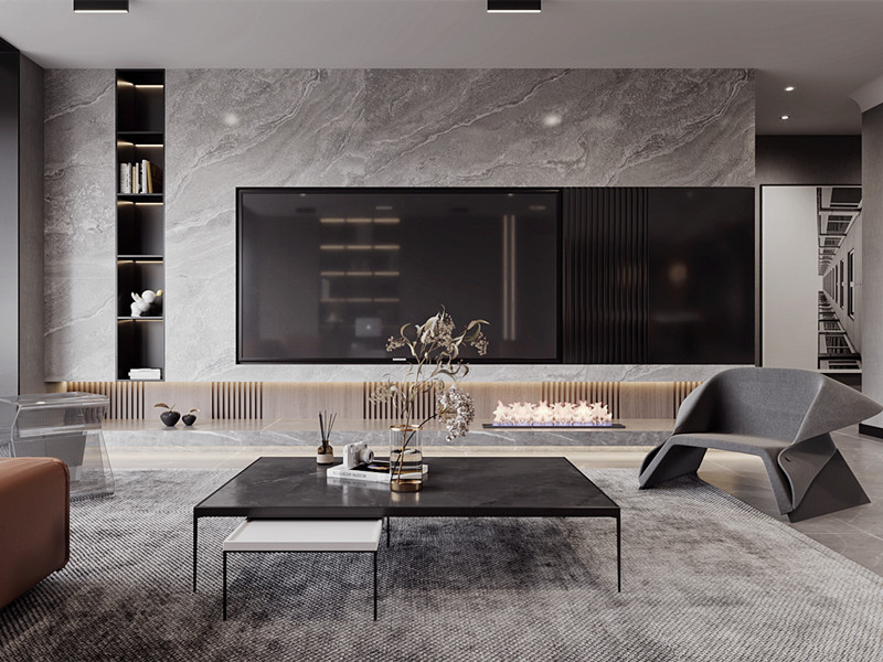 以灰色调做室内空间的色彩基调,搭配简洁流畅线条和优雅质感软饰,并结合光影和选材,呈现秩序感和优雅格调,诠释轻奢风格。