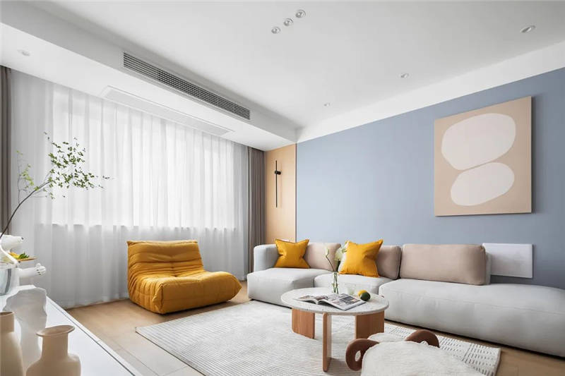 本案例为现代简约风的三居室,户型开间较大,以白色为主调,彩色系的软装作为点缀,地面的木色地板作为连接,整体氛围自然又温馨。