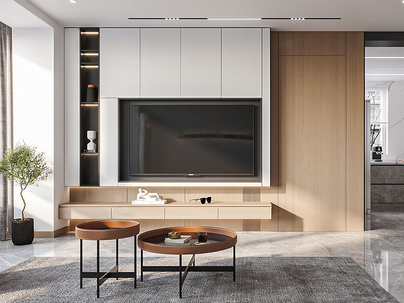 在装修家居客厅等空间时,在设计背景墙时,将卧室门做隐藏式设计并与其融合在一块,既能增加居室的私密感,又能彰显家居的整洁感。