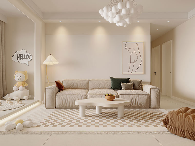 本案以简约风格为家居设计基调,采用大量奶油色系的装饰,并结合无主灯设计等,呈现恬美舒适的家居生活。