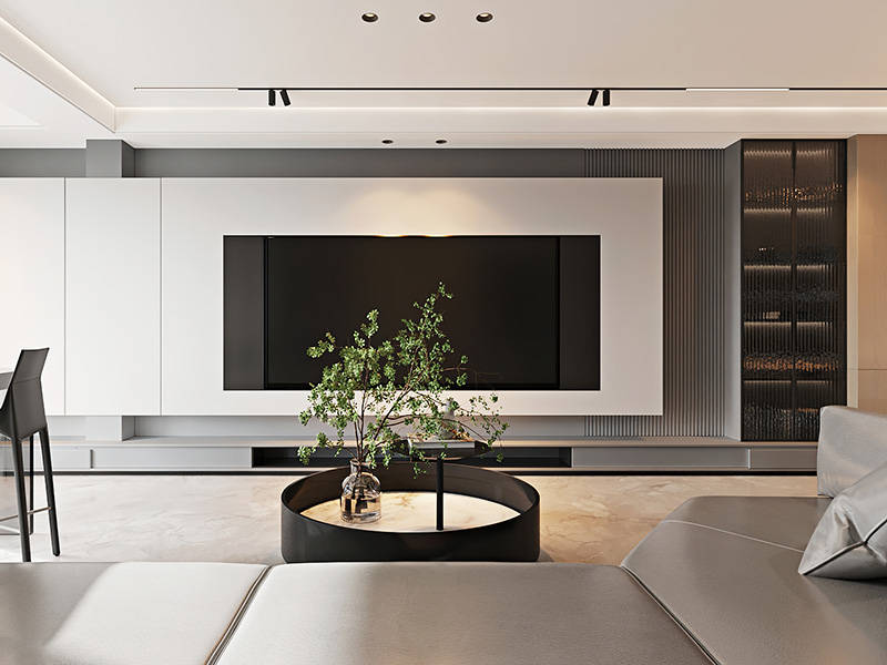 本案基于现代风格进行家居的装修设计,以黑白灰为空间主色调,并融入木色和暖色调软装,结合无主灯设计等,呈现符合当下审美的时尚惬意家居生活。
