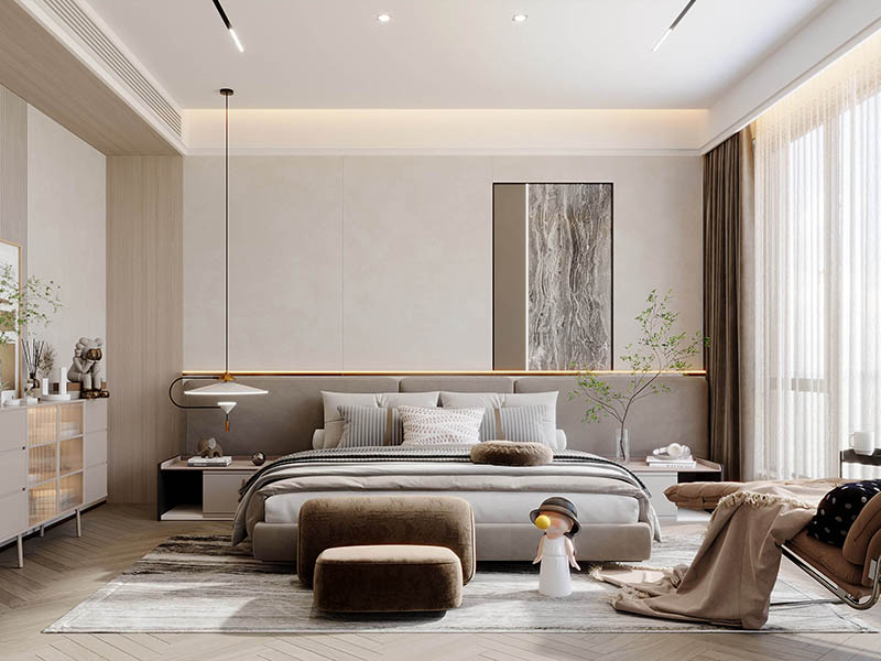作为家中主要休憩的功能空间,如果主卧室面积较大,可以考虑在呈现舒适惬意睡眠氛围的前提下,融入一些其他的功能设计,丰富空间的实用功能,增加居住舒适体验。
