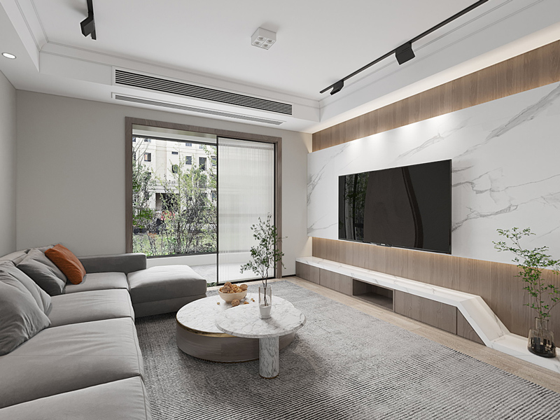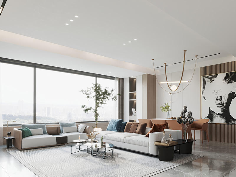 本案定位于现代风格,以白和浅灰为主色调,融入咖色和木色等装饰做点缀,呈现功能与美学兼具的生活空间。