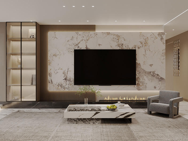 本案定位于轻奢风格,巧用彰显视觉冲击感的大理石与深色系木材的碰撞,并融入金属元素和无主灯设计做点缀,呈现优雅时尚家居生活。