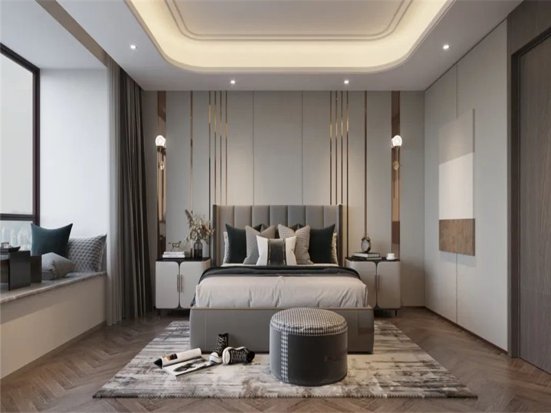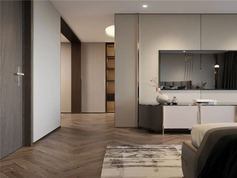 床头背景墙为软包设计,金属线条营造出轻奢感。电视背景墙隔断与梳妆台结合设计,衣帽柜与展示柜结合,节省了一定的空间。主卧卫生间使用玻璃作为隔断,保证了充足的采光。