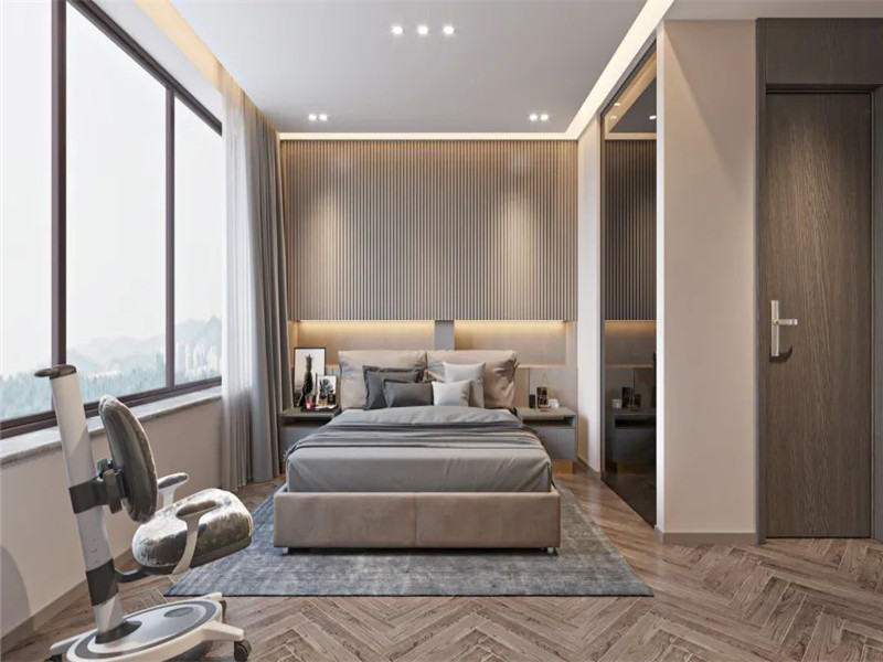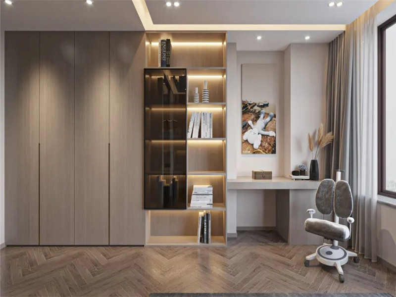客卧为榻榻米+衣柜+书柜+书桌的一体化设计,柜体通顶且靠墙,充分利用每一寸空间的同时预留出一定的行走空间,实现视觉上的开阔敞亮感。
