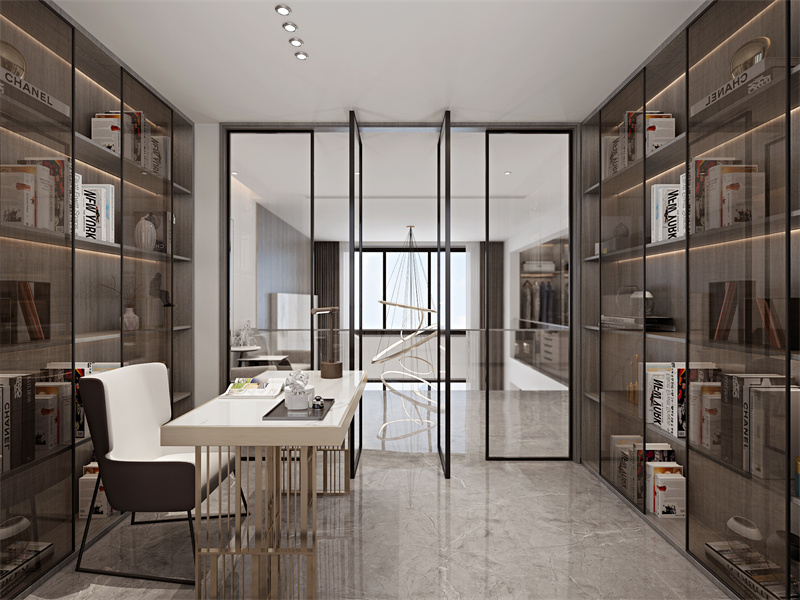 以玻璃与木质打造通透收纳墙,浅白与木色为主色调,线条利落。简洁的书桌布局,既满足居家办公的专注需求,也适配静心阅读的场景,通透感与秩序感兼具,尽显极简风格的质感与实用。