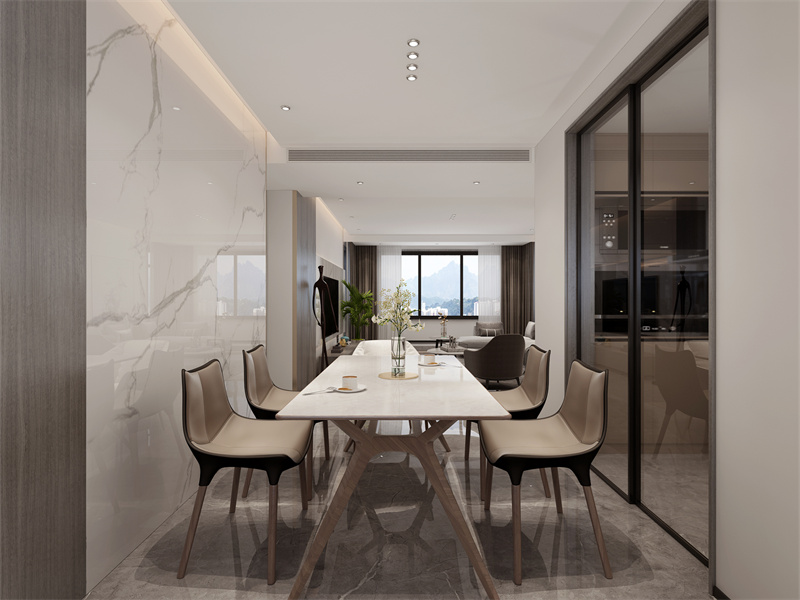 浅白色大理石餐桌搭配棕调餐椅,线条简约干净。空间与客厅通透相连,自然光与柔和灯光交织,既适配日常家庭用餐,也能承载小型亲友小聚,在极简设计里营造出雅致且舒适的用餐氛围。
