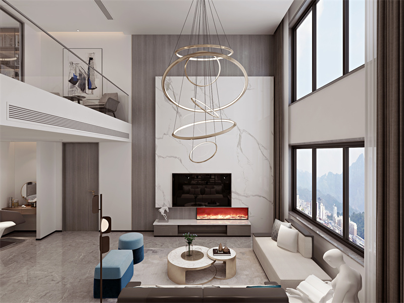 挑空结构结合极简设计语言,米白与木色相互映衬,环形艺术吊灯增添精致感。大面积窗户借景室外,空间既适合亲友聚会交流,也能让人独自享受开阔感,于极简中传递出大气与惬意。