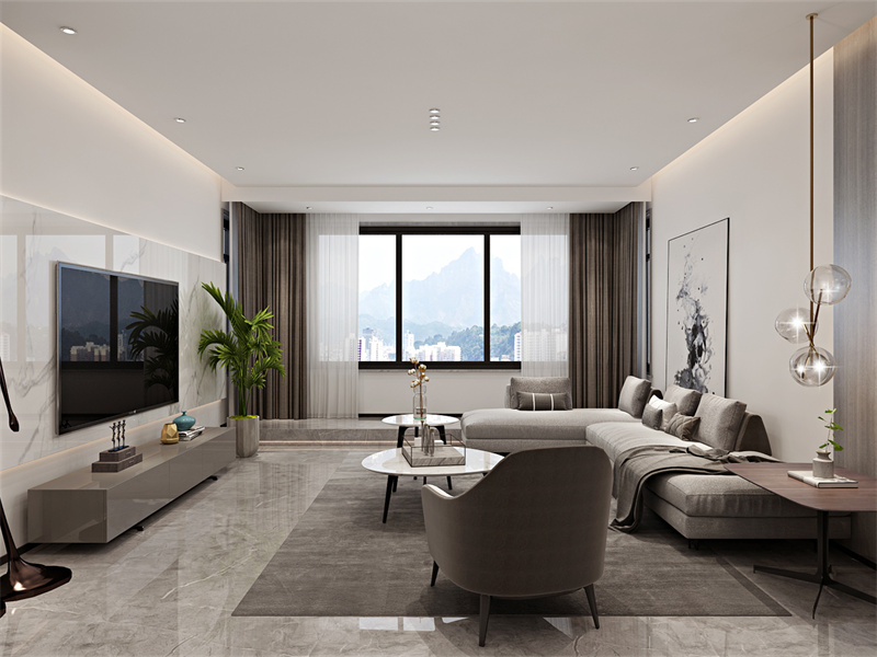 以灰白、浅棕为柔和主调,线条极度简洁。大窗户引入充足自然光线,灰色系沙发与简约家具组合,既适配家人围坐休闲、观景放松,又在极简布局中营造出松弛舒适的居家氛围。