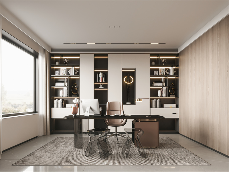 木色、黑白灰构建出沉稳雅致的氛围,通顶收纳柜与开放式展架兼顾藏书与展示功能,简洁的书桌布局,既适配居家办公的专注场景,也能承载静心阅读的时光,光影与材质的融合尽显格调。