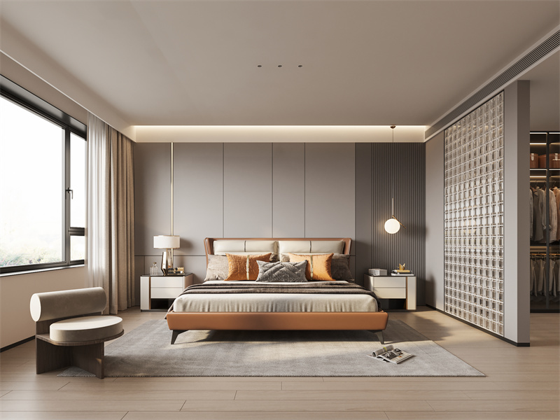 暖棕与浅灰交织出温馨静谧的主调,玻璃砖隔断增添空间层次,充足的收纳与柔和灯光相辅相成,既满足休憩放松的需求,也让睡眠空间在简约中透出意式质感。