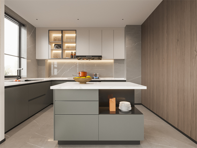 以灰、白为主色调,木色墙面点缀其间,开放式布局搭配岛台,形成“拿-洗-切-炒”流畅动线。既适配日常烹饪,也能成为家人围坐互动的小场景,简洁色调与充足收纳,让餐厨时光更显舒适有序。
