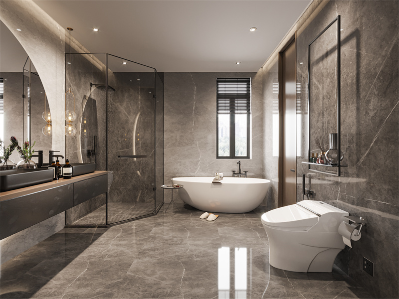 深灰大理石铺陈出时尚质感,玻璃隔断利落划分干湿区,金色灯具与黑色五金碰撞出轻奢感。双人台盆方便日常洗漱,独立浴缸是放松身心的角落,现代材质与通透布局,让卫浴时光兼具舒适与仪式感。