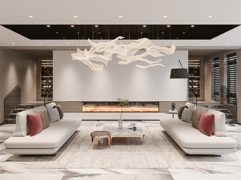 以黑白灰为基底,搭配暖棕点缀,艺术感吊灯如飘带般轻盈,对称沙发与大理石茶几营造平衡美学。这里适合家人围坐赏壁炉暖光,或与好友在酒柜旁小酌,简洁线条与精致陈设,让社交休闲都充满现代雅致。