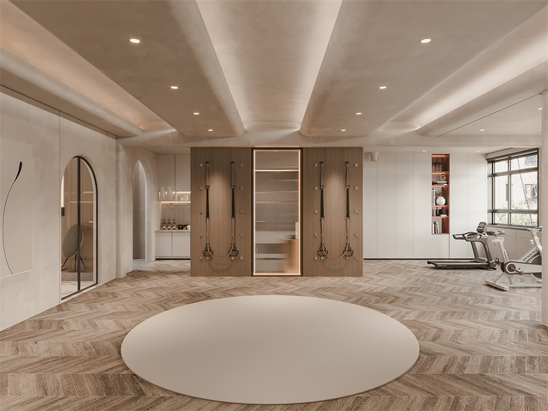 圆形区域可练舞、做瑜伽,一旁的健身器材满足运动需求,通透布局与隐藏式收纳,让居家运动、休闲都自在松弛,传递出现代生活的多元与舒适。