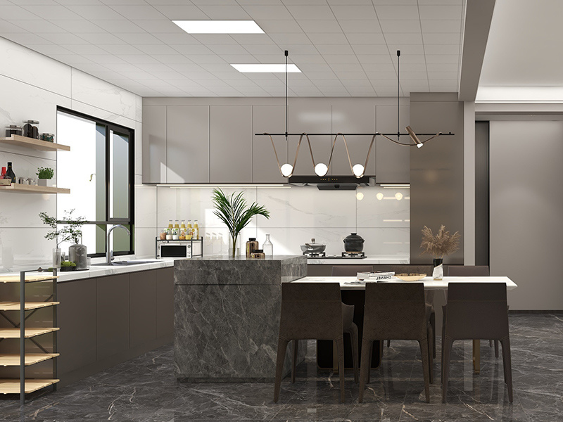 灰白与深咖交织出雅致基底,开放式布局让餐厨空间自然衔接。大理石岛台、造型感吊灯增添意式轻奢质感,充足的操作与用餐空间,适合家人协作备餐、围坐共享美食,在精致氛围里尽享烟火与社交之乐。