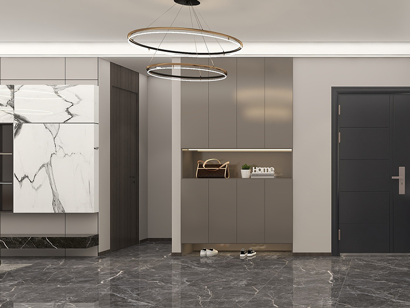 以灰、咖为主色调,简洁的一体化柜体搭配双层环形吊灯,既满足入户收纳需求,又营造出精致仪式感。意式简约的高雅格调从入门处铺陈,为日常归家与出门赋予优雅序幕,是实用与美学的巧妙融合。