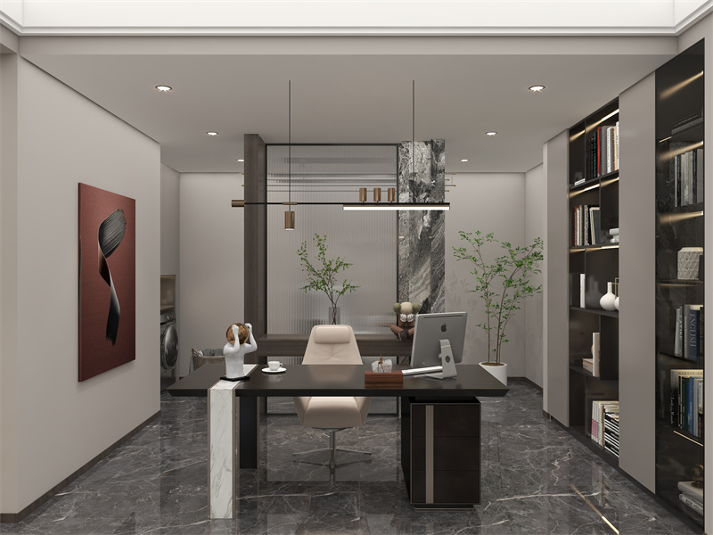 浅灰与深棕为主调,对称柜体与简约书桌体现意式秩序感与精致感。充足收纳空间、舒适办公椅满足阅读与工作需求,绿植、艺术画点缀其间,让居家办公与学习的时光也充满雅致氛围,实现功能与美学的平衡。