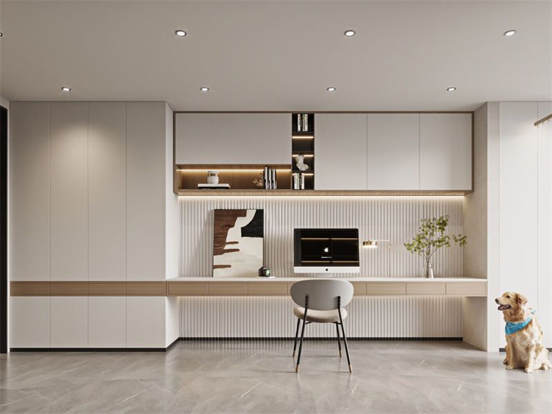 以白与木色构建出干净利落的空间,一体化柜体兼顾收纳与展示,简约书桌搭配舒适座椅,满足居家办公与阅读需求。柔和灯光与艺术挂画点缀,让工作学习时光也充满雅致,实现功能与美学的平衡。