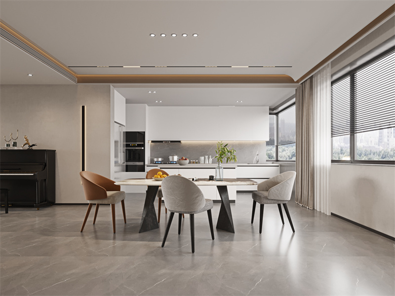 采用白、浅棕与灰色系,色调柔和统一。开放式布局让烹饪与用餐互动自然,简约造型的餐桌椅线条轻盈,既适合家人围坐共享美食,也能承载朋友小聚,在极简氛围里传递生活温度。