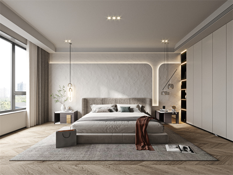 以米白、暖灰等低饱和色调为主,简洁线条与嵌入式灯光营造出宁静感,大衣柜让空间整洁有序。大窗引入自然光,搭配柔软床品,是卸下疲惫、享受静谧休憩的私域空间,能让人彻底放松身心。