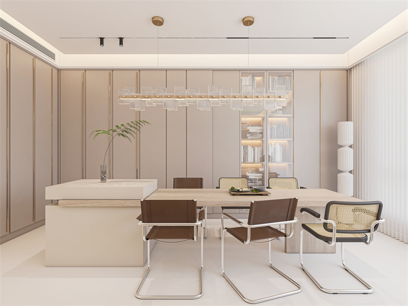 以浅棕、米白为主调,玻璃吊灯搭配皮质、藤编餐椅,岛台与长桌兼具精致与实用。日常家庭用餐或小型派对都适配,简洁布局让互动更自在,材质碰撞增添高雅格调。