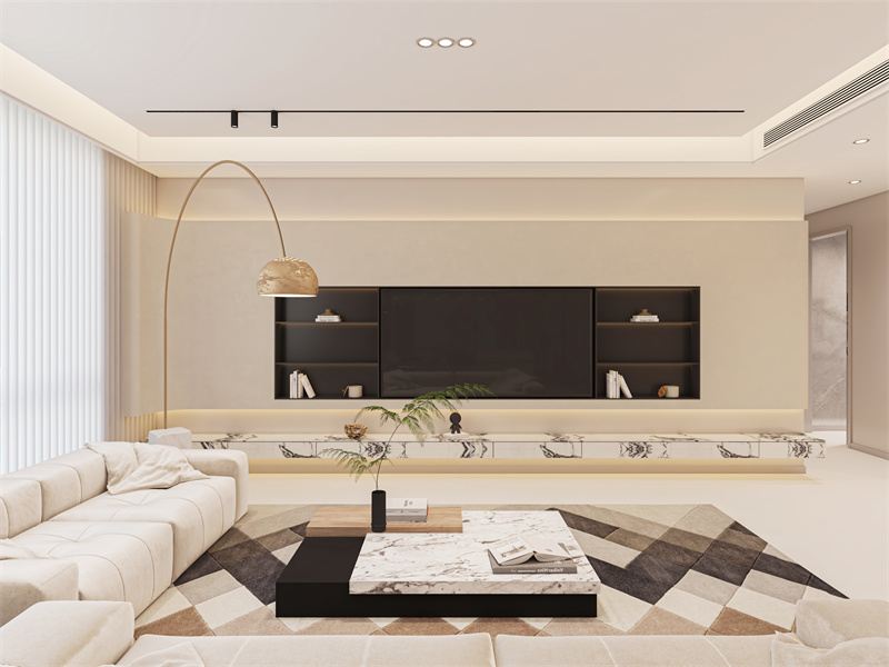 以米白、浅棕为柔和基调,电视墙结合嵌入式收纳与大理石台面,暖光灯带烘托氛围。简洁布局让空间整洁有序,适合家人围坐观影,在光影里享受放松休闲时光。