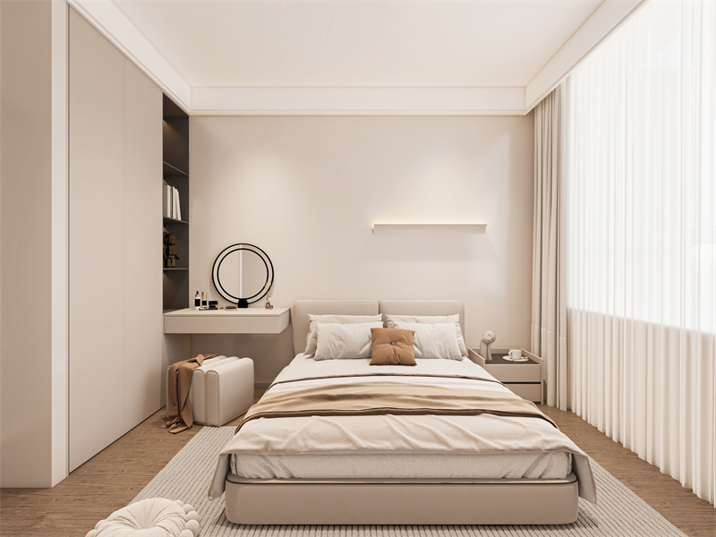 以奶油白、暖棕构建静谧基底,简洁柜体兼顾收纳与美观,柔软床品、弧形镜与柔和灯光搭配,大窗引自然光。作为私享休憩空间,能让人卸下疲惫,享受好眠与独处的松弛。