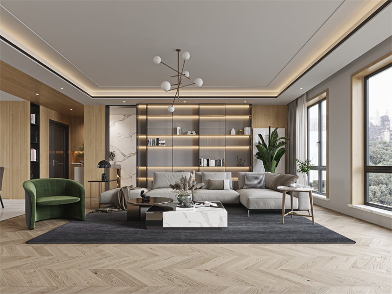 以木色为基调,融合现代线条,暖光收纳墙与艺术吊灯相衬,浅灰沙发搭配绿植,营造出兼具东方自然质感与现代舒适的社交空间,家人围坐或待客,皆能感受雅致氛围。