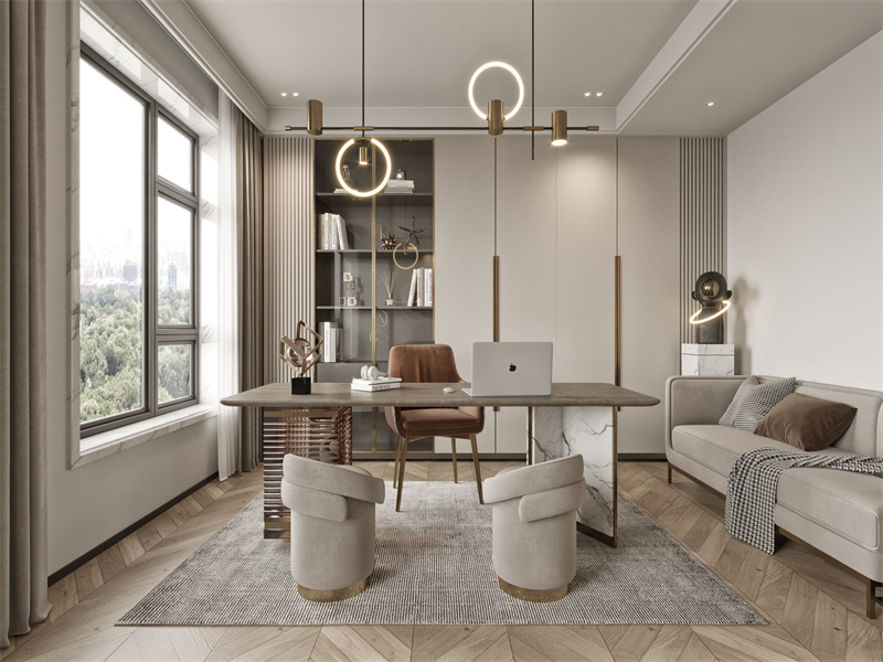 木色与浅米色调结合,书桌简约大气,收纳柜与金属元素点缀显精致,沙发区提供闲适阅读角,大窗采光充足,居家办公、阅读时,可在东方质感与现代舒适中专注享受时光。