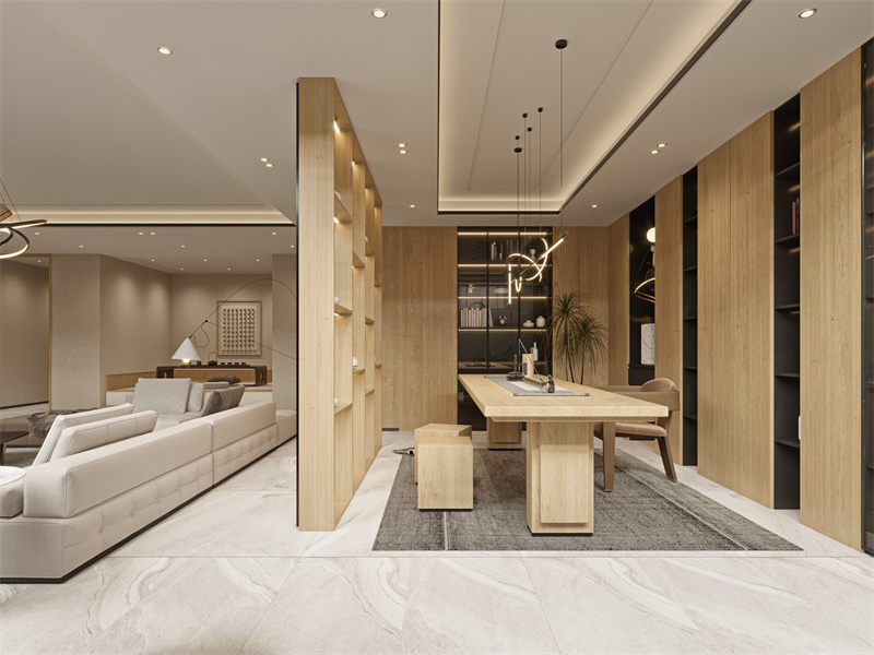 木色为主打造东方禅意,简洁茶桌与木质收纳立柱呼应,柔和灯光加持,既适合独自静心品茶,也可与亲友慢聊,在自然质朴中尽享中式生活的悠然。