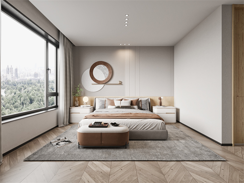浅灰墙面搭配木色细节,圆形装饰暗含东方韵味,大窗引景入室,柔软床品营造静谧休憩场,日常休憩时,能在简约与东方雅致融合中卸下疲惫。